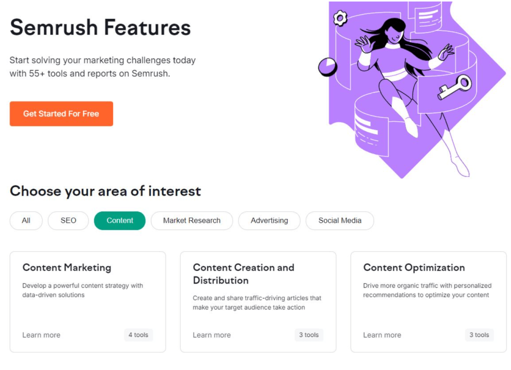 Semrush provides tools for SEOs, including ContentShake AI, which helps create SEO-friendly articles to increase organic traffic.